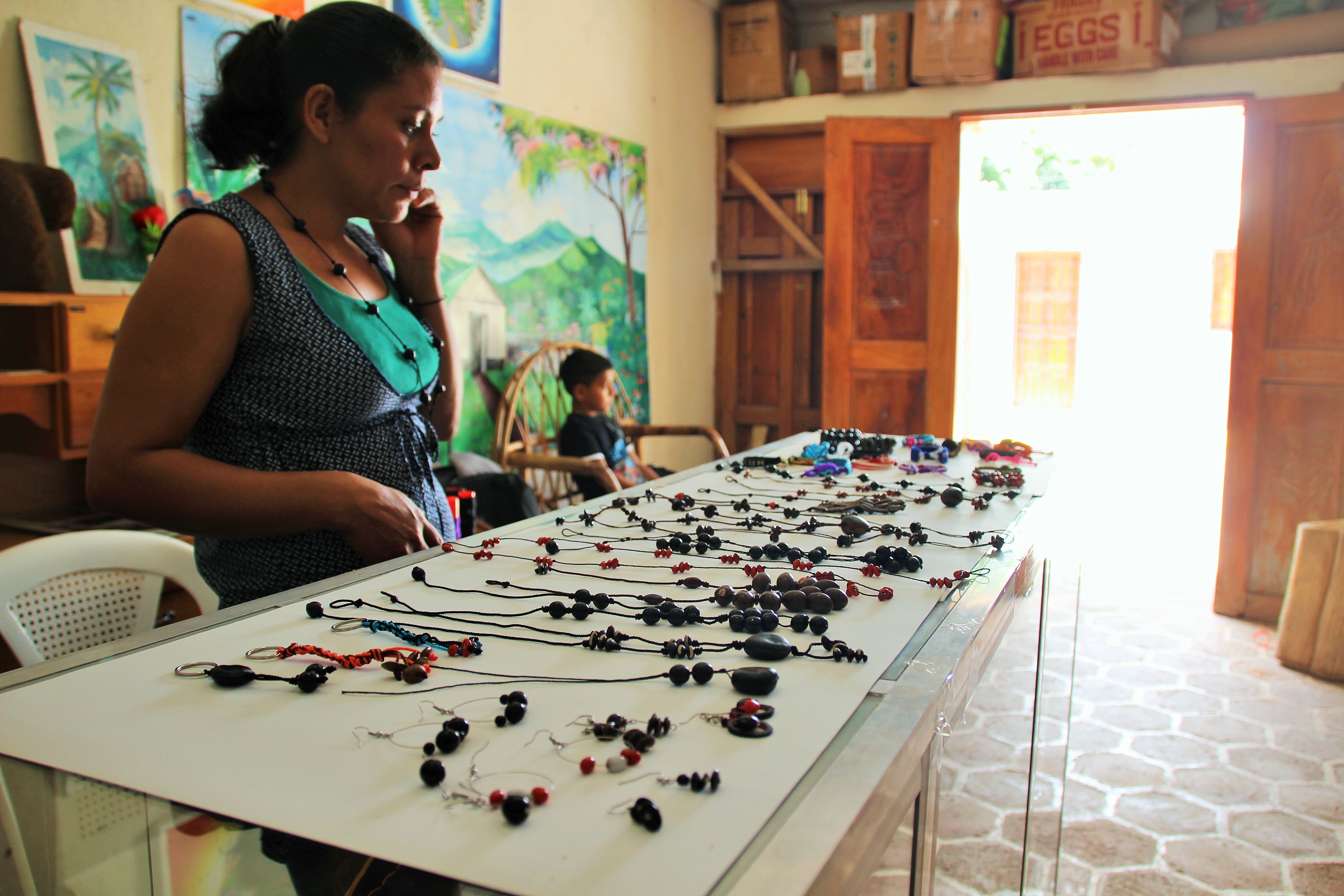 Ce discours sur l’éducation reviendra deux fois dans la même journée. Quand je parle avec Yosteni, elle m’explique, aussi, qu’elle élève ses enfants dans l’égalité homme- femme et qu’il est important qu’ils fassent tous des études. Yosteni a le regard perçant en me racontant sa vie. A 15 ans, elle se marie puis a rapidement des enfants. Ayant 4 enfants et aucune formation elle ne peut travailler, elle est complètement dépendante de son mari et est isolée du monde au sein de sa communauté. Heureusement, elle croise le chemin d’une volontaire espagnol qui encourage les femmes de sa communauté à trouver une activité commerciale pour participer aux revenus familiaux trop faibles. Après un échec dans la conception de confiture maison, elles se lancent dans la création de bijoux à partir de graines trouvées sur les terres de la communauté mais aussi en dehors.